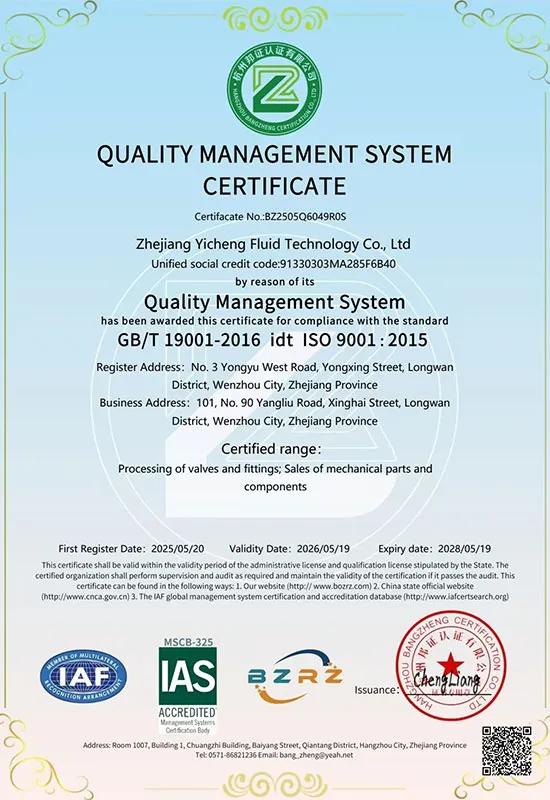 Мы понимаем, что качество является основой нашего предприятия. Поэтому мы строго придерживаемся международных стандартов, создав комплексную систему управления качеством, охватывающую все этапы от сырья до готовой продукции. Клапаны Чжэцзян Ичэн являются синонимом надежности, эффективности и долговечности. В будущем мы будем продолжать придерживаться нашей философии «Стремление к совершенству, построение будущего с честностью», основанной на инновациях. Мы будем сотрудничать с глобальными клиентами и партнерами, чтобы совместно решать задачи промышленного управления потоками жидкостей.